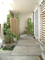 外観は珪藻土の白い外壁とダークな木のルーバーの壁が非常に印象的で、 モダンな雰囲気を創り出しています。 |