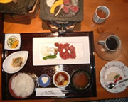 メニューも日替わりランチや丼物などの手軽なものから、和・会席コースまで、こだわり抜かれた美食が数々揃っていました。 我々の注文したサイコロステーキ定食はなんとバーナーに溶岩で出来た鉄板をあっつあつに熱した上でジュージュー焼きながら食べるっ!なんとも美味です。。。 |